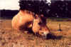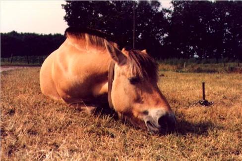 Tussen Kaulille en Grote Brogel land ik aan bij manege Breughelhoeve. Avond al, half acht. Rianne mag in een weitje naast de buitenbak. Het gras staat hoog. De manegepaarden staan binnen. 'Buiten worden ze gek van de dazen.' (Een geluk voor Rianne, die er met haar dikke huid minder last van heeft en zich ongans vreet.) 'Alleen een vliegendeken helpt', zegt de manegebaas. Zijn vrouw komt erbij staan. 'Achthonderd franc', meent ze. 'Duur!' Zo'n vijf tientjes, becijfer ik. Valt wel mee. Althans als je, zoals ik, er maar één nodig hebt.